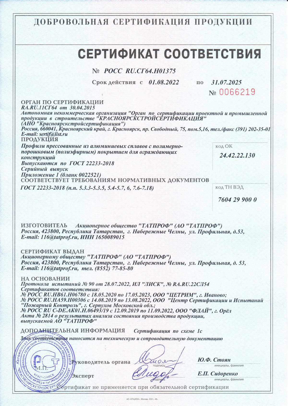 Сертификат о соответствии алюминиевых систем