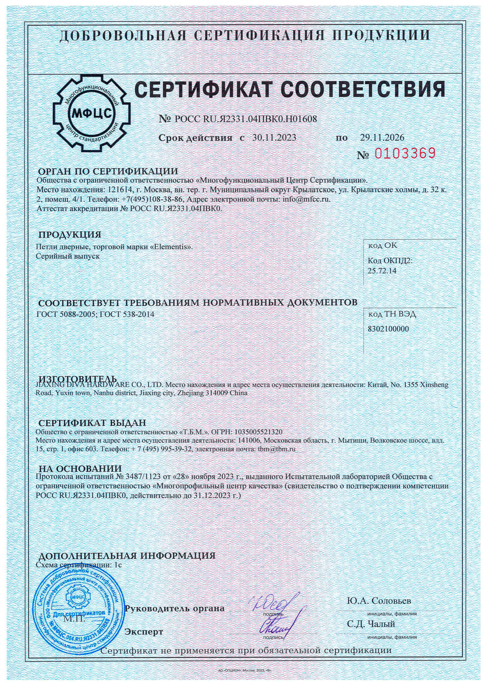 Сертификат о соответствии Elementis