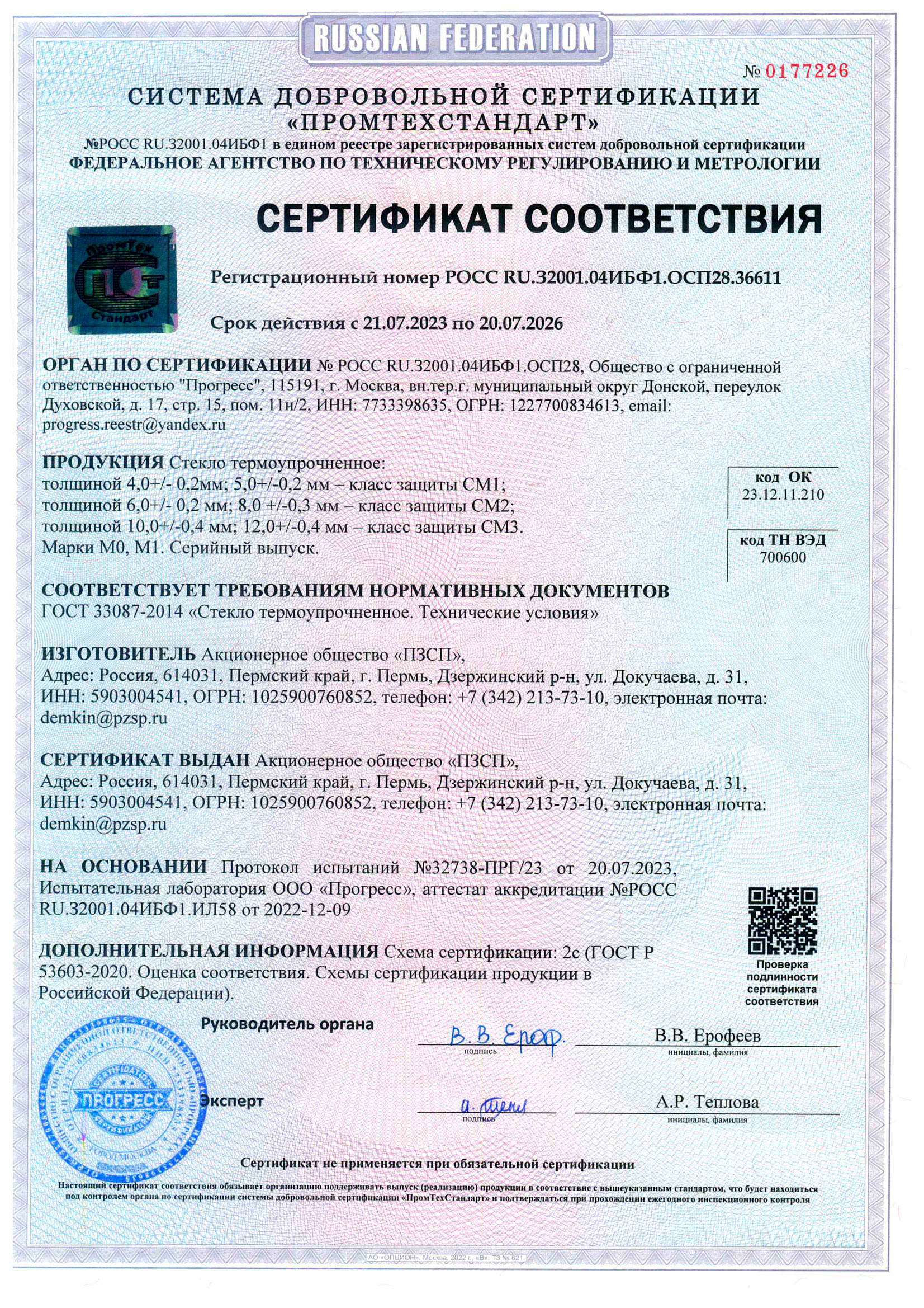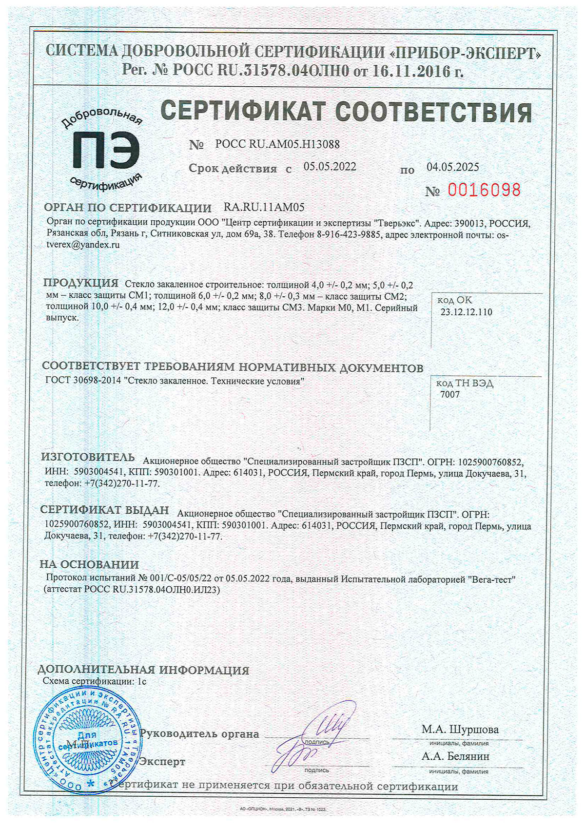 Сертификаты о соответствии закалённого стекла